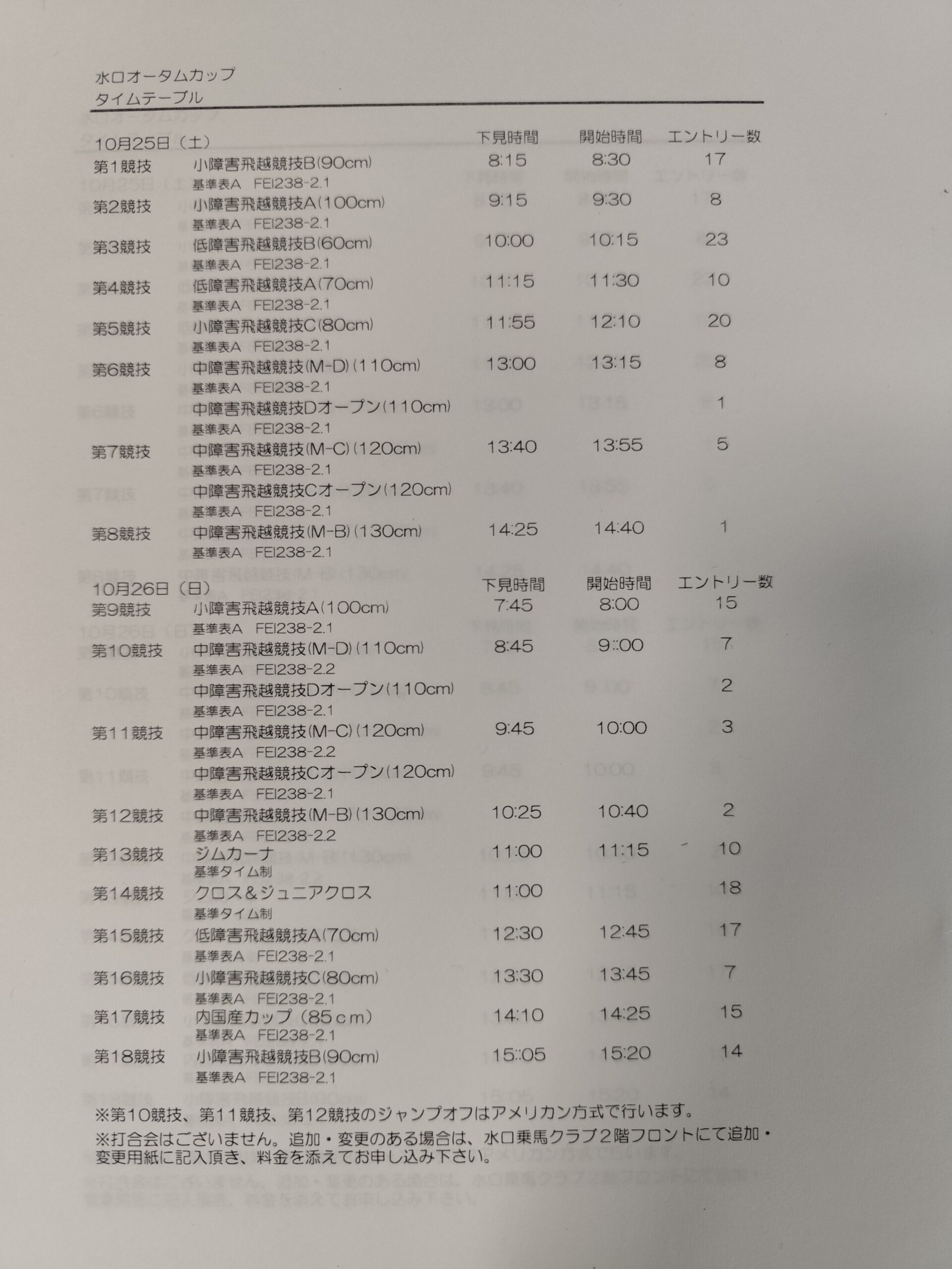 10月25日〜26日に滋賀県甲賀市の水口乗馬クラブで開催される、日本馬術連盟公認の障害馬術競技会『水口オータムカップ』のタイムテーブルです