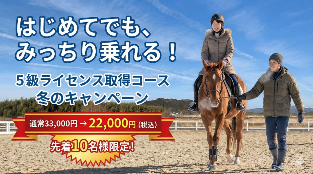 おすすめ体験コース:5級ライセンスキャンペーン HORSE RIDING CLUB お申し込み 1月・2月限定!特別キャンペーン たった5時間で、憧れの乗馬ライセンスを。 馬に乗るのは初めてだけど、どうせならみっちり乗ってみたい。 そんなあなたの夢を叶える「5級ラ... -