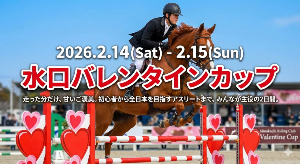 2月の水口乗馬クラブにて、恒例の「水口バレンタインカップ」を開催いたします!本大会は日本馬術連盟公認種目を含む競技会であり、全日本大会への出場権獲得を目指す方はもちろん、競技会デビューの初心者の方まで、幅広くご参加いただける大会です。 優... -